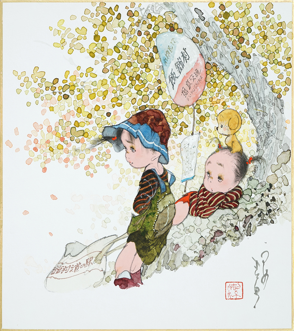 □白木製の色紙額に額装された、直筆サイン・落款入りの色紙に描かれた貴重な水彩原画です。